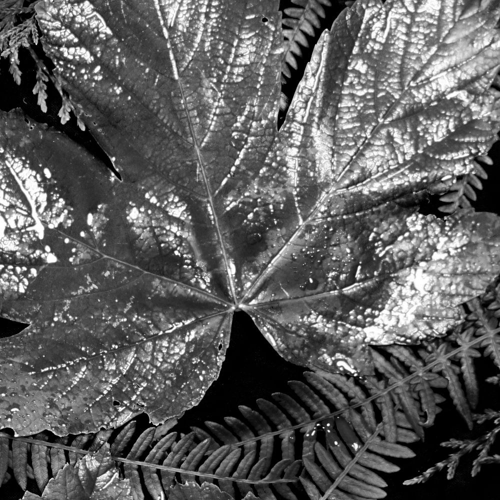 Brombeerblatt mit Farn, Komposition in Schwarz und Weiß.