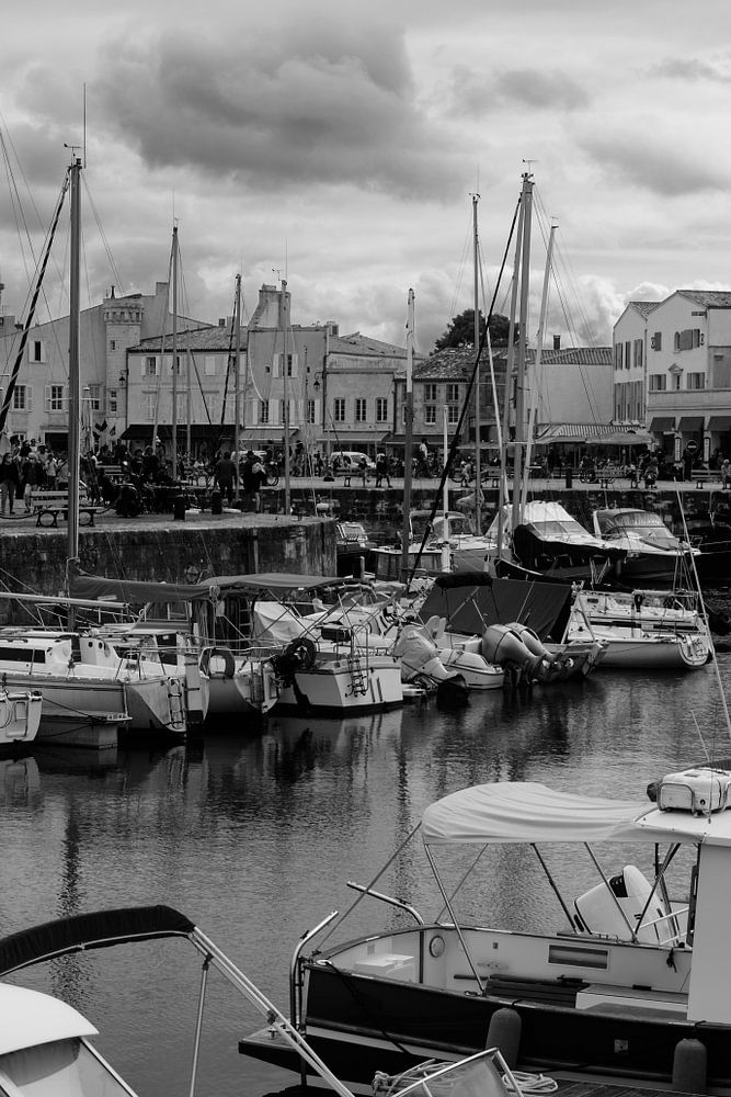 Blick auf den Hafen von Saint-Martin-de-Ré mit Booten und Menschen, die an einem sonnigen Sommertag spazieren gehen, in schwarz-weiß