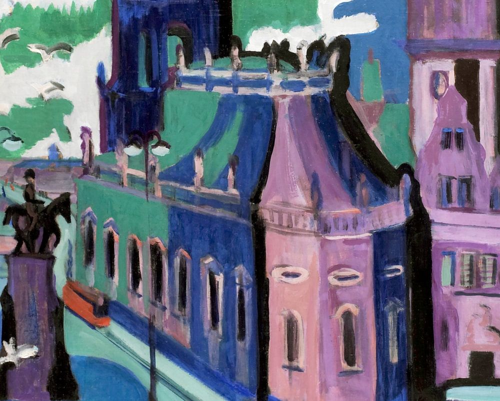 Ab 1910 malte Kirchner zahlreiche Großstadtbilder, vor allem von Berlin. Ein berühmtes Werk aus dieser Zeit ist der Potsdamer Platz in Berlin, auf dem er zwei Prostituierte darstellte.[1] In Kirchners Werken spielten die Randfiguren der Gesellschaft oft die Hauptrolle.