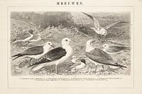 Pädagogischer Teller im Vintage-Stil, der sieben verschiedene Möwen in einer fantastischen Küstenlandschaft zeigt. Dazu gehören Heringsmöwe, Mantelmöwe, Zwergmöwe und Möwe.