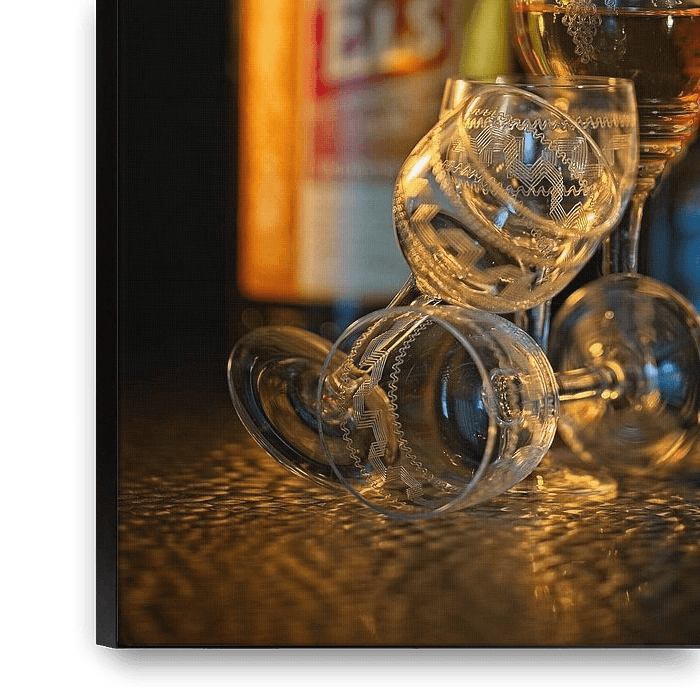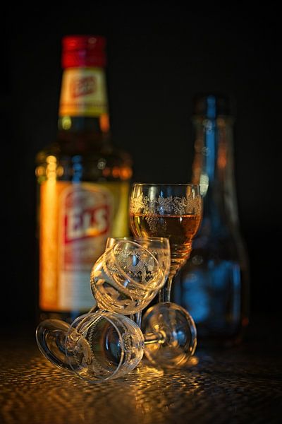 Stillleben mit Karaffe, Flasche und einem Set Weingläser im Licht mit goldenem Schimmer, der die Gravur in den antiken Weingläsern zur Geltung bringt.