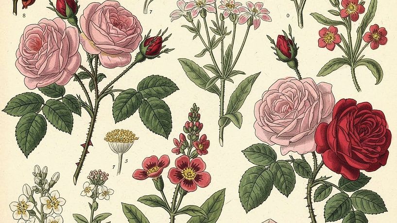 Eine wunderschöne wissenschaftliche Illustration im Vintage-Stil, die verschiedene Rosenarten in voller Blüte zeigt. Diese botanische Studie zeigt zartrosa und tiefrote Rosen mit filigranen Blattdetails auf einem weichen, gealterten Papierhintergrund. Dieses zeitlose Werk ist perfekt, um eine romantische, rustikale oder klassische…
