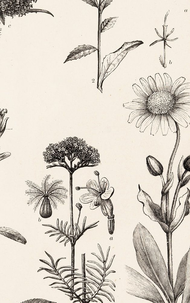 Schwarz-Weiß-Stich aus der Zeit um 1900, auf dem sogenannte Aggregate abgebildet sind. Zu sehen sind u.a. der Teestrauch, Baldrian und Wollgras.