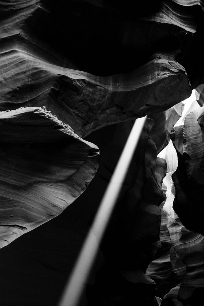 Ein wunderschönes Schwarz-Weiß-Foto eines Lichtstrahls, der im Antelope Canyon, einer engen Schlucht im Glen Canyon in den Vereinigten Staaten, leuchtet.