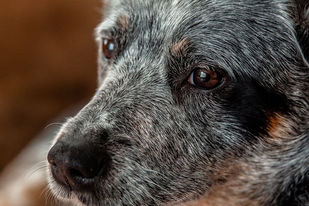 Dieses Farbfoto in Nahaufnahme bietet einen fesselnden Blick in die Augen des Hundes: Ein gestromter Hund blickt direkt in die Kamera mit einem Blick voller Vorfreude. Die hellen, aufmerksamen Augen und die spitzen Ohren des Hundes dominieren den Vordergrund und lassen vermuten, dass er zum Handeln bereit ist. Der unscharfe Hintergrund ist eine städtische Umgebung mit subtilen Details wie einem Fahrradrad, die auf ein mögliches Abenteuer im Freien hinweisen. Das Bild fängt die Essenz der treuen und aufmerksamen Natur eines Haustiers ein.