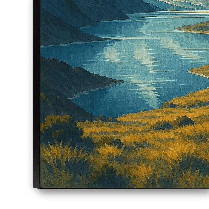 Das Kunstwerk mischt kühles Alpenblau mit warmen Goldtönen der umliegenden Tussock-Felder und schafft so eine harmonische Palette, die sowohl die raue Wildnis als auch das einladende Licht darstellt. Die Komposition führt den Blick des Betrachters von den Gräsern im Vordergrund über den ruhigen See bis hin zum himmelstrebenden Gipfel - eine natürliche Reise nach oben, die Streben, Klarheit und die Majestät der natürlichen Welt symbolisiert.