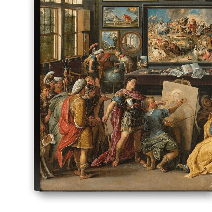 Van Haecht malte eine Geschichte aus der klassischen Antike nach links. Dort können Sie sehen, wie Apelles das Porträt von Campaspe, der Herrin von Alexander dem Großen, malt. Er findet das Ergebnis so schön, dass er sich an dem Porträt freut und die Geliebte Apelles gibt. Alexander zieht Kunst der Natur vor.