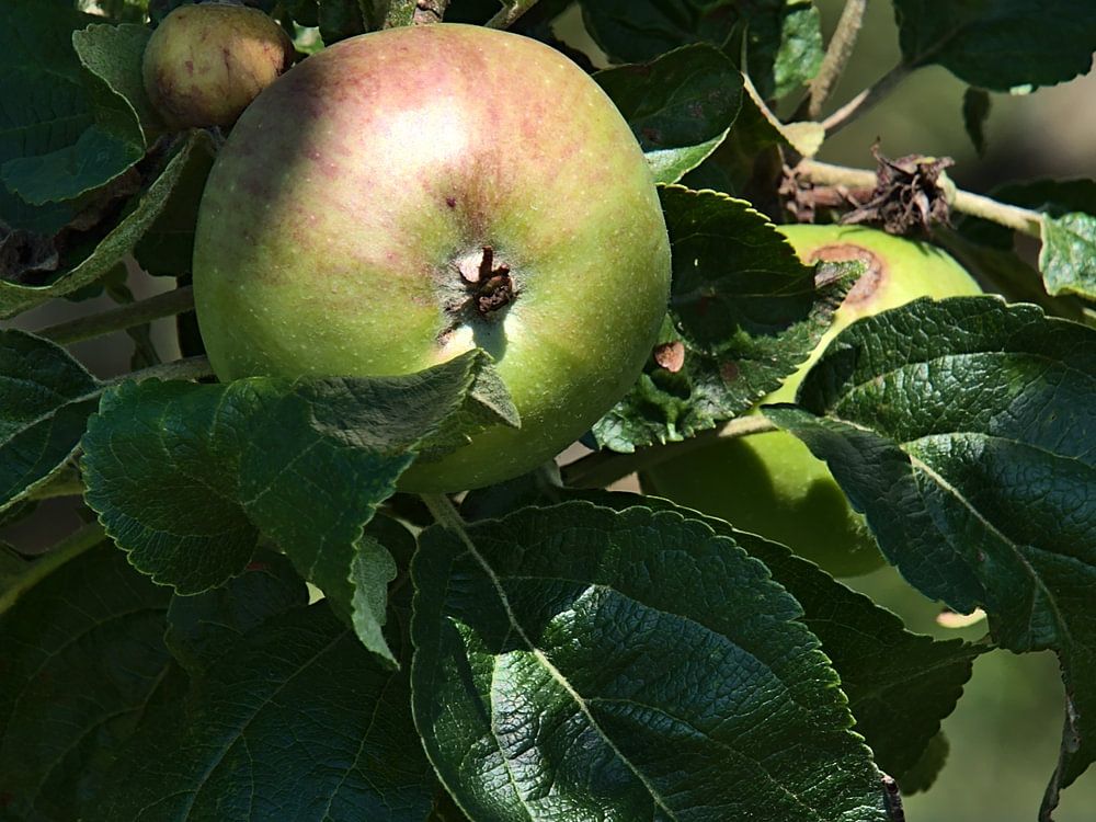 Nahaufnahme eines leicht rötlich verfärbten Apfels im Sonnenlicht umgeben von grünen Blättern am Ast eines Apfelbaumes im Sommer mit Bokeh im Hintergrund.
