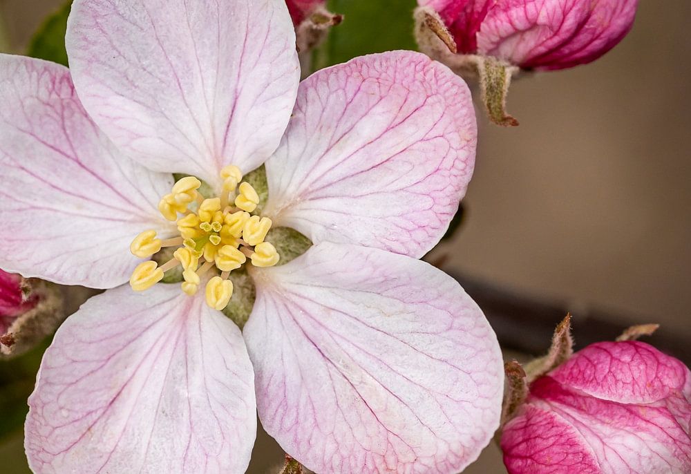 Die Apfelblüte mit ihrer weißen und rosa Farbe ist immer ein schöner Anblick in den Obstgärten im Frühling. Diese Apfelblüte ist in der Betuwe fotografiert.