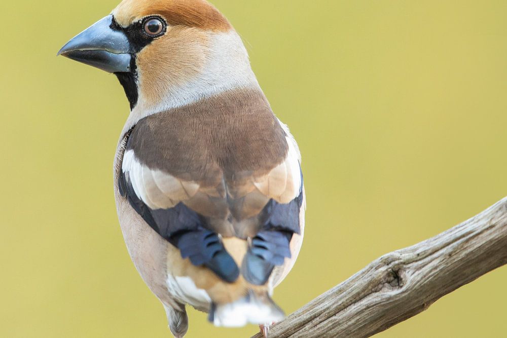 De Appelvink met zijn zeer krachtige snavel, met maar liefst een bijtkracht van 50 kilo per vierkante cm om harde zaden te verbrijzelen .