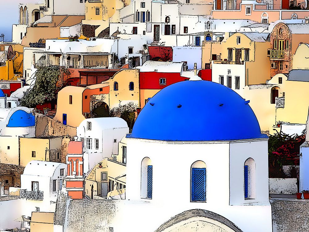 Dit is een aquarel tekening met zwarte schetslijnen van Santorini, Griekenland. De originele tekening is omgezet in een digitaal bestand.