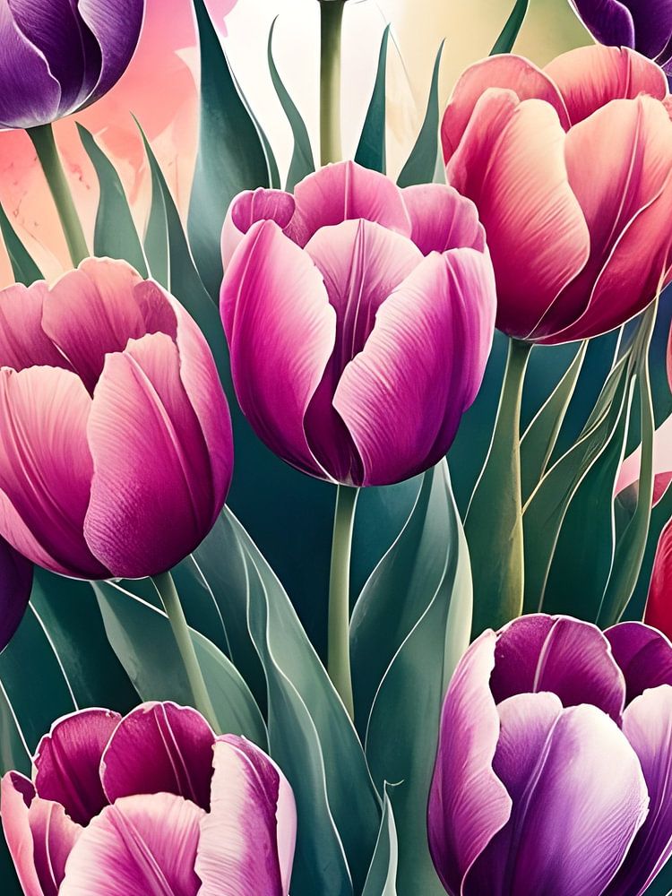 Ein lebhaftes Aquarell, das die zarte Schönheit eines Tulpenstraußes einfängt. Üppige grüne Blätter umschließen die Blüten, die einen atemberaubenden Farbverlauf in Lila und Rosa aufweisen. Weiche, diffuse Farbspritzer im Hintergrund verstärken das Blumenarrangement und schaffen eine verträumte und elegante Ästhetik.