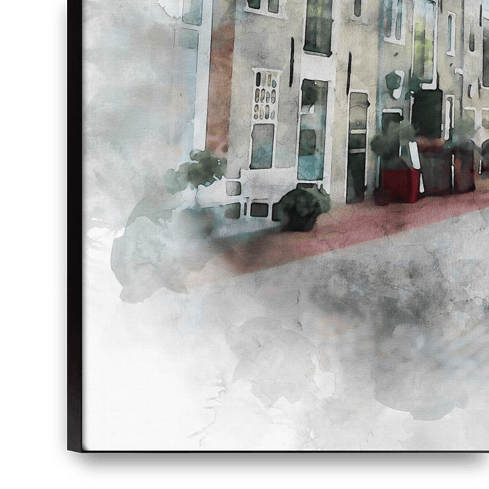 Aquarell des Kinderdijk in Middelburg, Zeeland. Der Kinderdijk mit seiner Promenade und Straße hat viele historische Gebäude. Dabei handelt es sich zumeist um Handelshäuser und Lagerhäuser, die in Wohnungen aus der VOC-Zeit umgewandelt wurden.