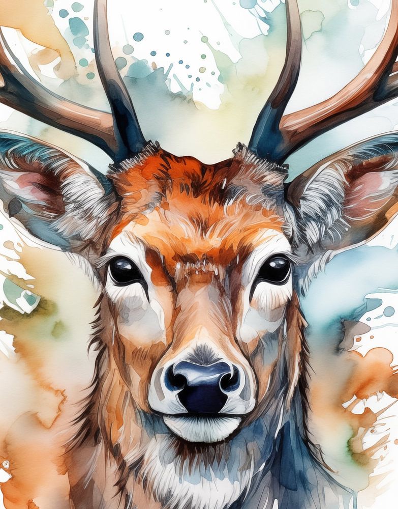 Aquarell des Kopfes eines Rothirsches mit großem Geweih auf dem Kopf, dargestellt vor weißem Hintergrund