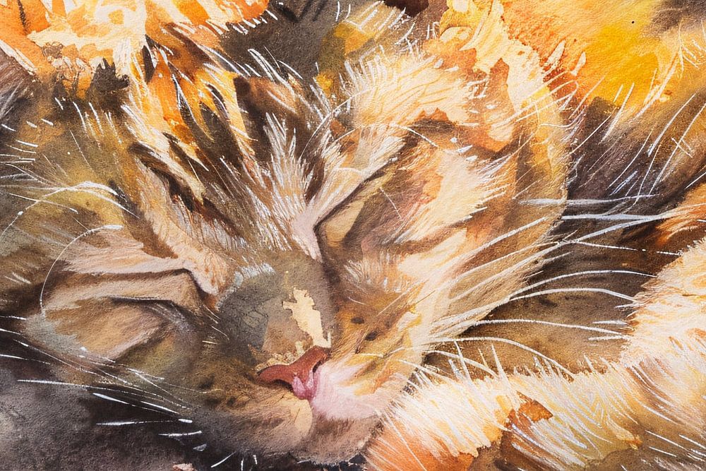 Dieses bezaubernde Aquarell fängt den friedlichen Moment einer schlafenden Katze ein, eingebettet in eine sanfte Umgebung. Die warmen Farbtöne des Gemäldes, die von Orange und Braun bis hin zu subtilen Grautönen reichen, vermitteln ein Gefühl von Komfort und Gelassenheit. Dieses Werk strahlt einen zeitlosen Charme aus, der perfekt in jedes Schlafzimmer oder Büro passt, wo es eine friedliche Atmosphäre schafft. Die zarten Pinselstriche und detaillierten Strukturen unterstreichen die liebevolle Sorgfalt, mit der dieses Kunstwerk geschaffen wurde, und machen es zu einem wunderbaren Geschenk für jeden Katzenliebhaber oder Kunstsammler, der ein einzigartiges Stück sucht, das sowohl Ruhe als auch Schönheit ausstrahlt.