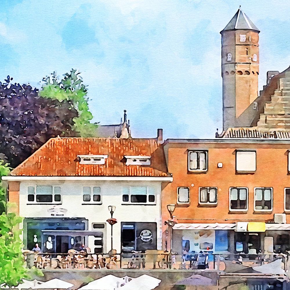 Stimmungsvolle Aquarellaufnahme der gemütlichen Umgebung des alten Hafens der historischen Stadt Hulst, Zeeuws-Vlaanderen.