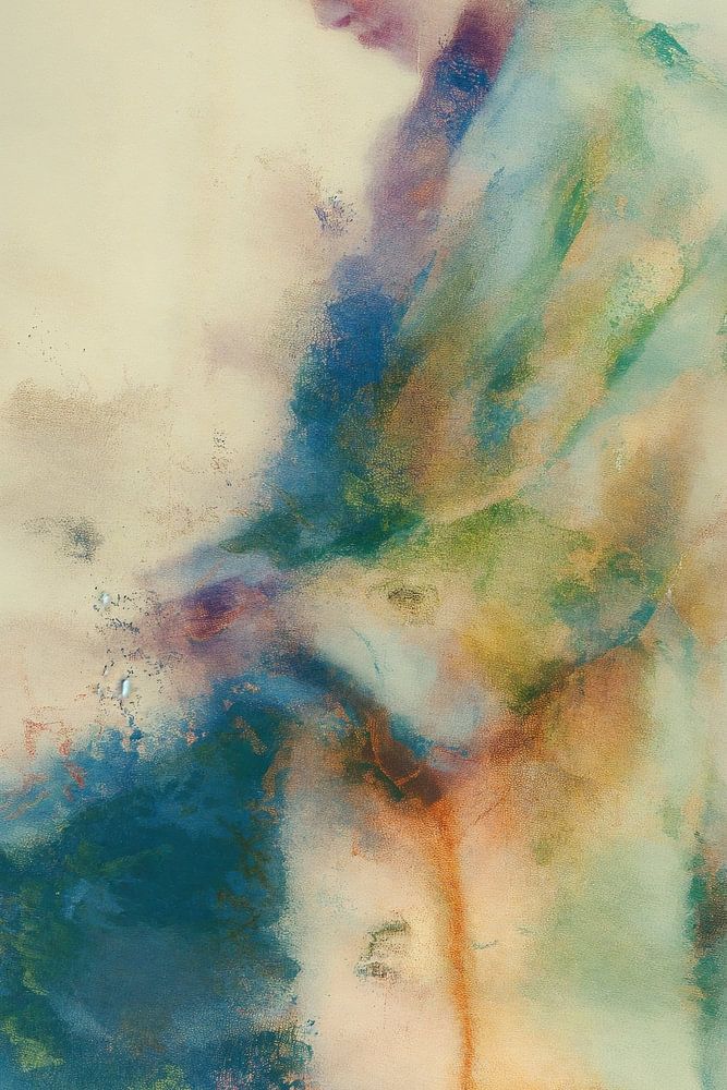 Ein ätherisches Kunstwerk, in dem eine Figur in sanften, fließenden Aquarellfarben im Raum zu verschwinden scheint. Die türkisfarbenen und mintgrünen Farbtöne verschmelzen mit warmen Erdtönen und schaffen eine verträumte Atmosphäre. Die kontemplative Pose der gemalten Figur, kombiniert mit der verwaschenen Technik, vermittelt ein Gefühl von Zeitlosigkeit und innerer Ruhe.