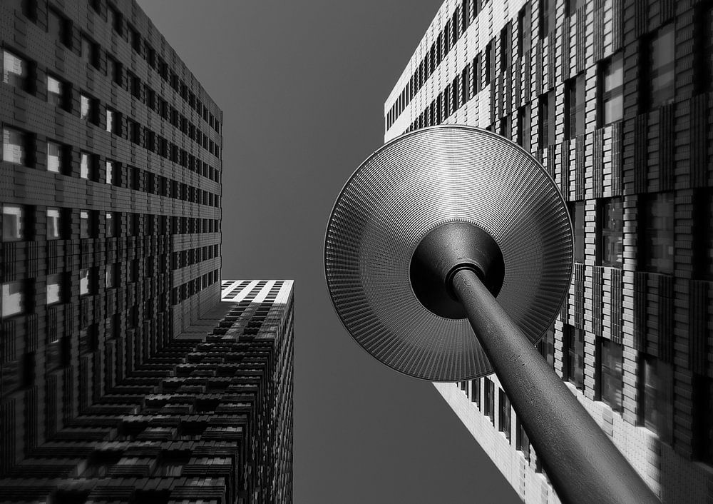Schwarz-Weiß-Fotografie. Architekturfotografie eines Gebäudes an der Zuidas in Amsterdam. Das Foto wurde senkrecht nach oben aufgenommen, mit einem Lichtmast im Vordergrund.