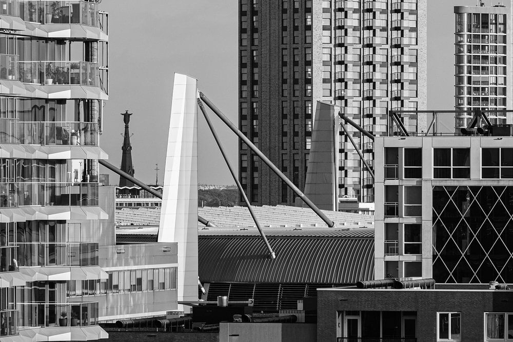 Schwarz-Weiß-Foto der Architektur von Eindhoven. Die gewählte Perspektive schafft ein kompaktes Stadtbild mit den Höhepunkten Eindhovens.
