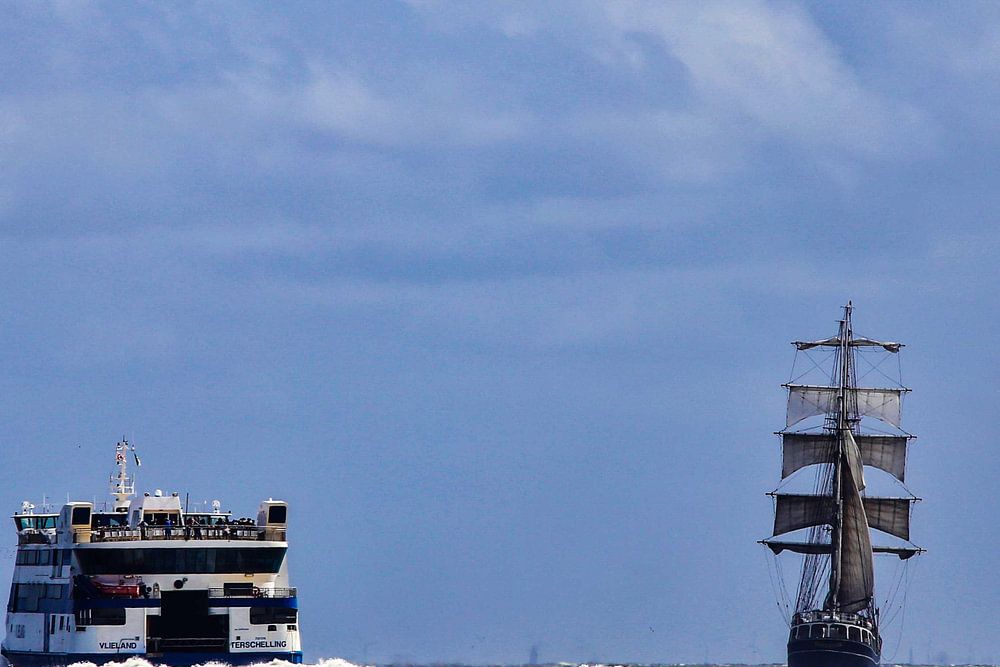 MS Vlieland op de Waddenzee met traditionele zeilschepen