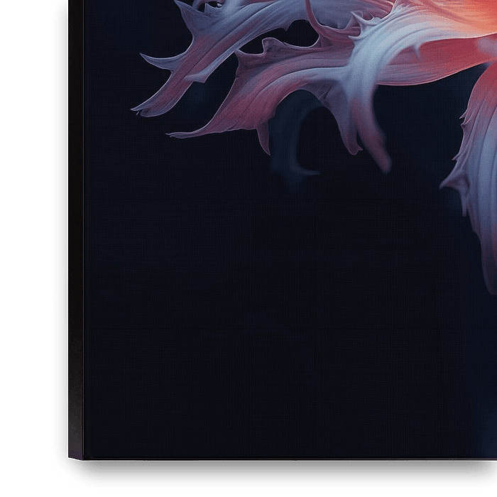 Das Bild stellt die Schönheit und Faszination von Blumen in einem dunklen, schwarzen Umfeld dar. Die rosa-orange Farbe der Blume und der kräftige Pinkton, in dem sie thront, verleihen dem Bild eine auffällige und fesselnde Wirkung. Die Blume ist in der Mitte des Bildes und nimmt einen großen Teil des Bildes ein, was ihr eine…