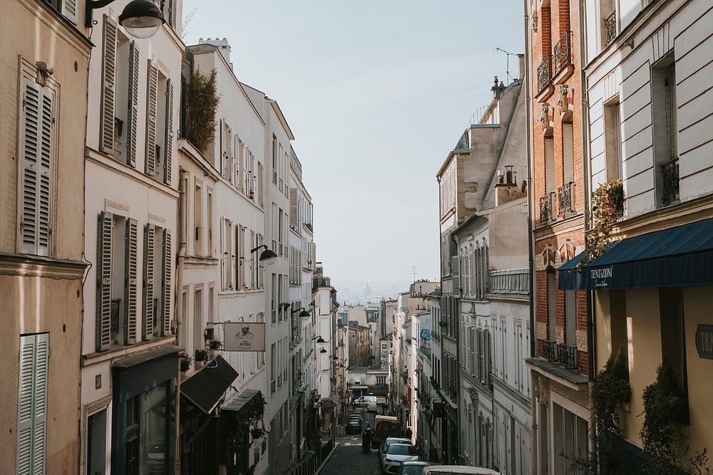 Bei unserem Spaziergang durch das Montmartre-Viertel sind wir an dieser sehr stimmungsvollen Straße mit Restaurants und Geschäften in Paris Frankreich entlanggelaufen. Da man hier etwas höher geht, hat man einen guten Blick auf den Rest der Stadt. Montmartre befindet sich im 18. Arrondissement.