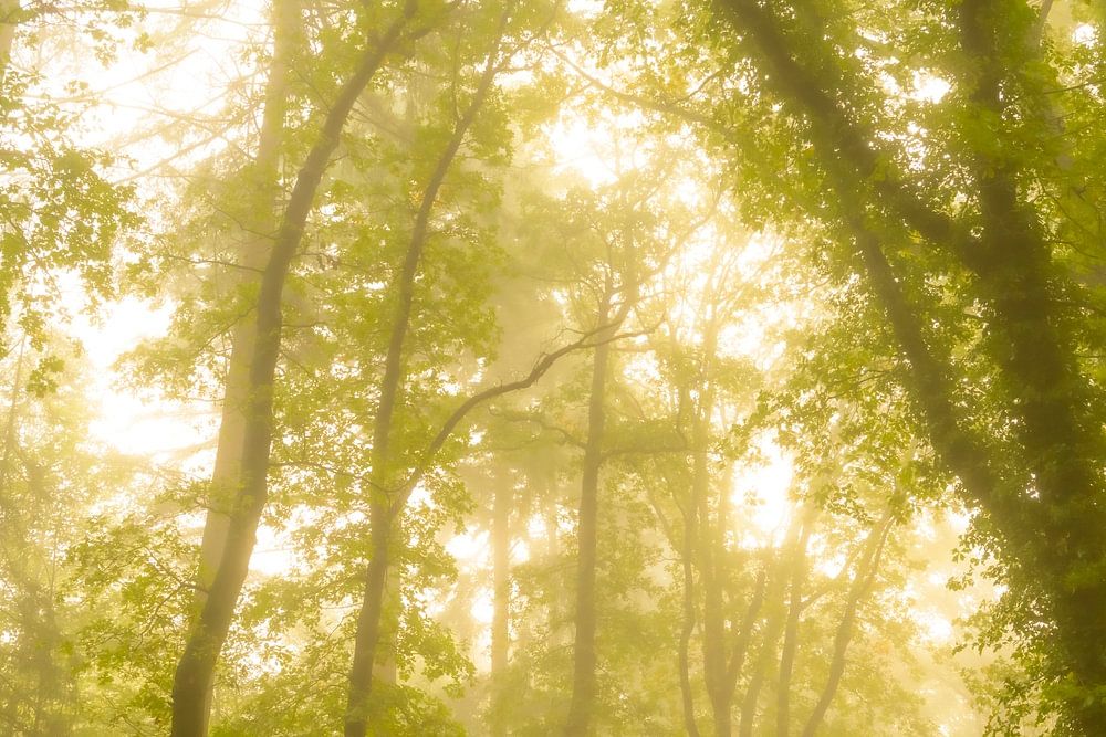 Blick nach oben in einen stimmungsvollen Wald mit grünen Blättern an den Bäumen im Herbst und Nebel in der Luft. Der Nebel verleiht dem Wald eine magische Atmosphäre mit den Blättern, die sich an diesem frühen Herbsttag im Kloosterbos in Gelderland gerade verfärben.