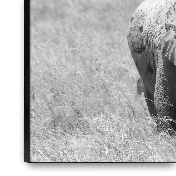 Bestelle das Foto Auf Safari in Afrika: Elefantenmutter mit Jungen in der Serengeti-Ebene (schwarz-weiß) von Rini Kools als Reproduktion auf Leinwand, Alu-Dibond, als Poster, Fototapete oder Acrylglasbild.