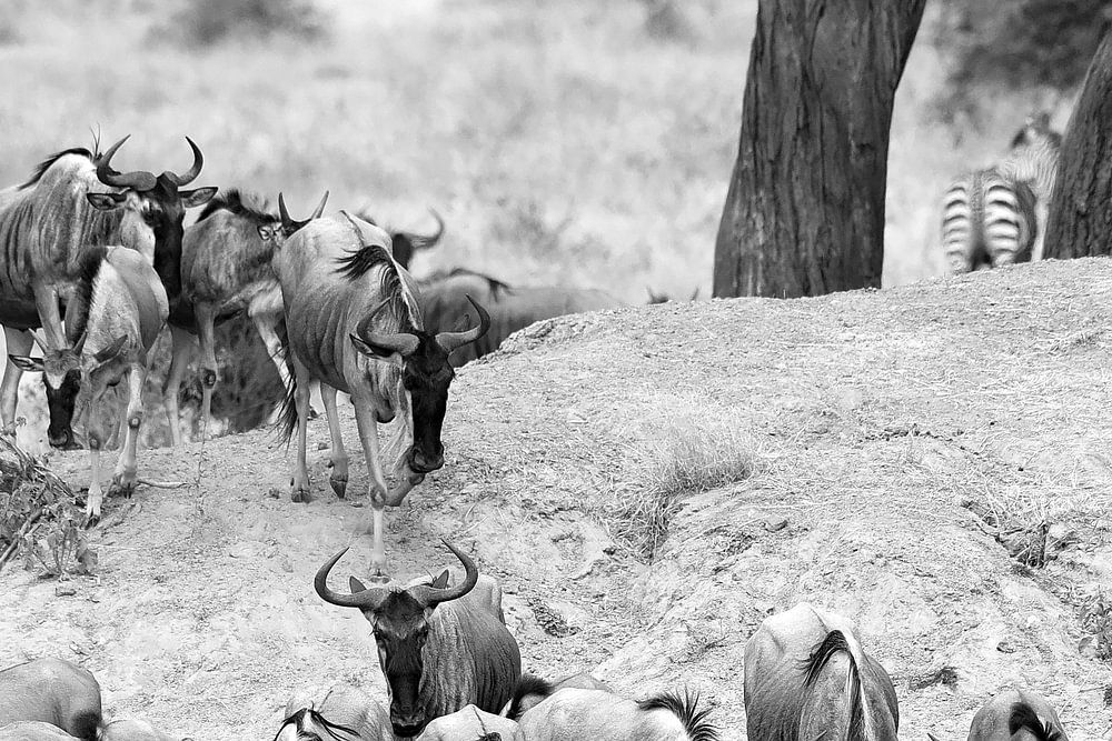 Gnus oder Gnus wandern in der Trockenzeit in nährstoffreiche Gebiete. Gnus reisen Tausende von Meilen pro Jahr. Jungtiere können bei der Geburt schnell in die Herde aufgenommen werden, manchmal schon zehn Minuten nach der Geburt. Bild auch in Farbe erhältlich.