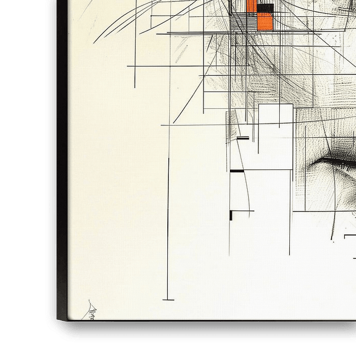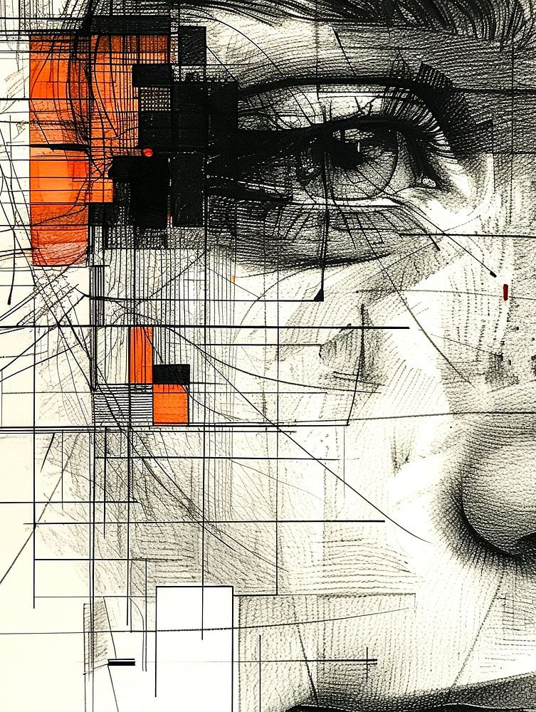 Ein Porträt einer schönen Frau mit surrealistischen Elementen, bestehend aus zarten Bleistiftlinien und digitalen Glitch-Effekten. Der Hintergrund besteht aus weißem Papier, wodurch ein Kontrast zwischen den schwarzen Tuscheumrissen auf ihrem Gesicht und den grauen Strichen um sie herum entsteht. Ein kleiner roter quadratischer Fleck ziert ein Auge und macht es noch komplexer. Dieses Werk vermittelt Emotionen durch detaillierte Gesichtszüge und ist von abstraktem Expressionismus und Cyberpunk-Kunststilen inspiriert.