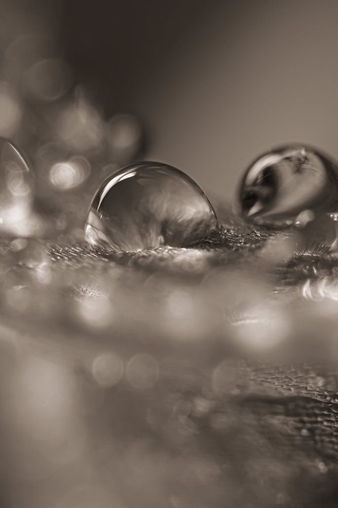 "Tropfen auf dem Blütenblatt" ist ein Makrofoto von Wassertropfen auf (und an) einem Hyazinthenblatt. Da es sich nur um ein sehr kleines Stück handelt, das fotografiert wird, und der Fokus auf einem kleinen Stück liegt, entsteht ein Bild, das man nicht sofort erkennt: Abstraktion. Die Farben in diesem Werk sind hauptsächlich Braun- und Grautöne. Man könnte dieses Werk als modern abstrakt bezeichnen, aber da der Fokus auf einer Reihe von Tropfen liegt, gibt es immer noch etwas, an dem man sich festhalten kann, etwas Wiedererkennbares, das einem das Gefühl gibt, etwas wiederzuerkennen! Die runden Formen der Tropfen in diesem Werk geben ihm etwas Weiches und Ruhiges. Andererseits erzeugen die Beleuchtung, der Schnitt, die Farben und der Kontrast eine gewisse Spannung.