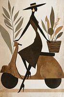 Dieses Kunstwerk fängt einen Moment müheloser Eleganz ein. Eine schlanke weibliche Silhouette, gekleidet in ein fließendes Kleid und einen breiten Hut, fährt entspannt auf einem Roller. Die Formen sind grafisch und stilisiert, mit einer subtilen Textur, die an Vintage-Drucke und Illustrationen aus der Mitte des Jahrhunderts…