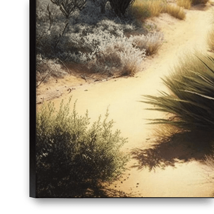 „Auf dem Weg durch die Wüste“ fängt eine ruhige Wüstenszene ein, in der sich ein sandiger Weg sanft durch eine trockene Landschaft schlängelt. Gesäumt von einer Vielzahl von Sträuchern und vereinzelten Bäumen, ist das Gelände in warmes Sonnenlicht getaucht, das durch einen teilweise bewölkten Himmel fällt. Das Wechselspiel von Licht und…