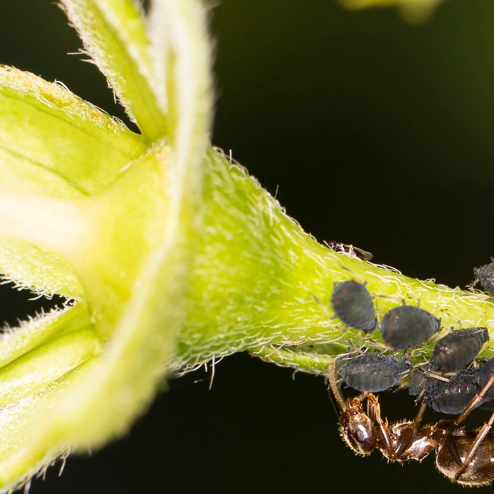 Diese Ameise melkt ihre Läuse. Die Schwerkraft scheint keine Wirkung zu haben.