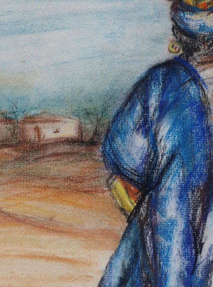 Pastellzeichnung einer gambischen Frau, die mit Melonen auf den Markt geht, um sie zu verkaufen. Alles wird auf dem Kopf getragen und ist typisch für Afrika.