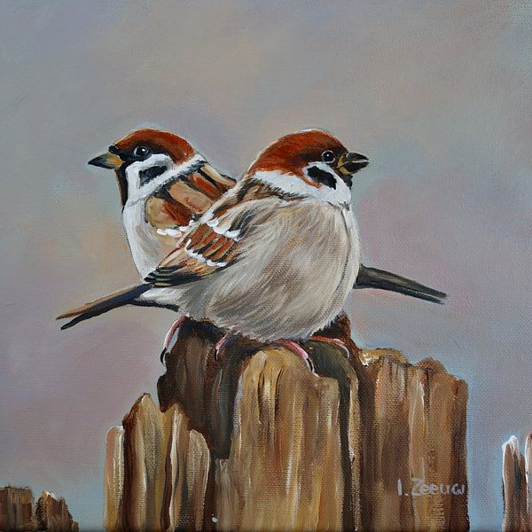 Gemälde von zwei Spatzen. Gemalt mit Acrylfarbe auf Leinwand. Sanfte Pastelltöne färben den Himmel. Ein ländliches Gemälde der niederländischen Natur.