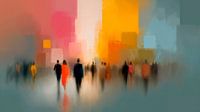 Ein abstraktes Kunstwerk, das eine Gruppe von Silhouetten zeigt, die gemeinsam vor dem Hintergrund verschwommener Gebäude laufen, die zusammen eine dynamische Stadtlandschaft bilden. Die Komposition verbindet abstrakte Elemente mit einer dynamischen Farbpalette, wodurch eine lebendige städtische Atmosphäre entsteht.
