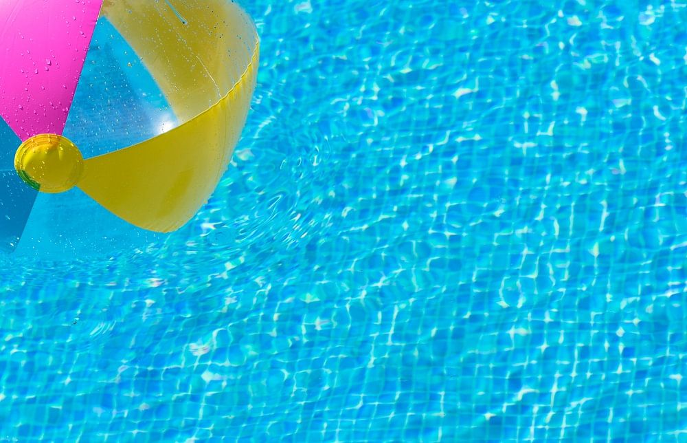 Aufblasbare bunte Strand Ball schwimmen auf gekräuselten blauen Schwimmbad