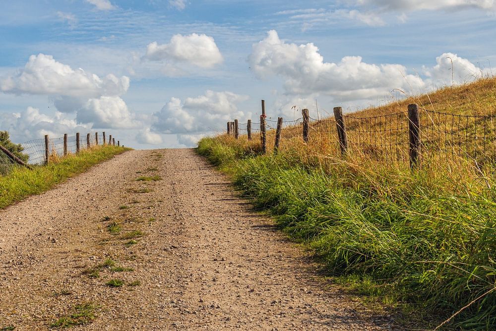 Eingang zum Deich entlang des Flusses Amer in der Nähe des Dorfes Drimmelen, Provinz Noord-Brabant. Auf beiden Seiten der Einfahrt befinden sich Zäune aus Holzpfosten mit Maschendraht. Es ist ein schöner Tag zu Beginn des Herbstes. Der Himmel ist blau mit weißen Kumuluswolken.