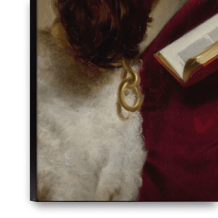 Ein Detail eines Hundes, der neugierig sein Herrchen, eine Frau, die ein Buch liest, im Stil eines klassischen Gemäldes betrachtet.