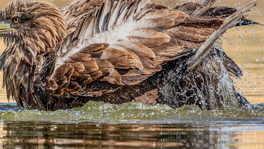 Dieses beeindruckende Foto fängt einen seltenen und kraftvollen Moment ein: einen Weißkopfseeadler, der im Wasser badet, wobei Tausende von Wassertropfen wie glitzernde Perlen umherfliegen. Sein scharfer, durchdringender Blick blickt direkt in die Linse, voller Wachsamkeit und Majestät.