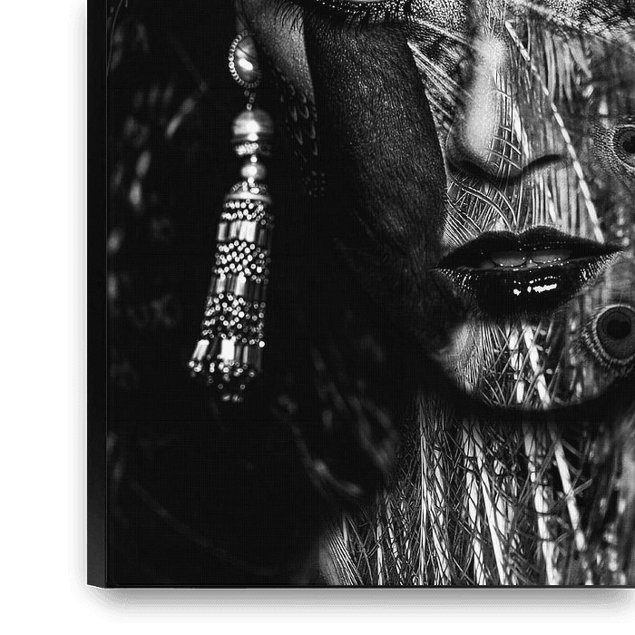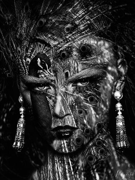 Bestelle das digitale Kunst Bild Augen des Pfaus – (Schwarz-Weiß) von Nevanilio Sancho als Reproduktion auf Leinwand, Alu-Dibond, als Poster, Fototapete oder Acrylglasbild.