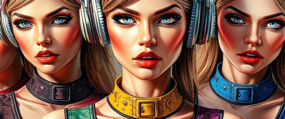 Gekleidet sind sie in futuristische, farblich variierende Outfits, die zwischen Modenschau und Science-Fiction-Welt oszillieren. Ihre spacigen Accessoires – breite Halsbänder, stilisierte Hüte, moderne Kopfhörer – verleihen ihnen eine ästhetische Präsenz, als seien sie Zeitreisende aus einer anderen Wirklichkeit, zwischen Retro und Zukunft.