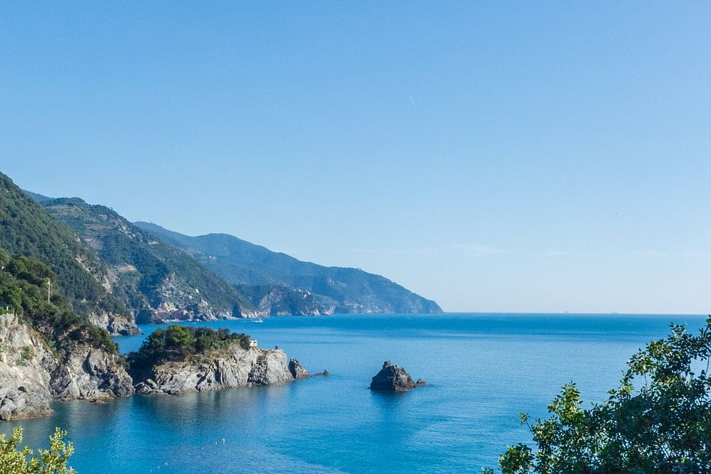 Blick auf die Küste von den Bergen in der Nähe der Stadt Monterosso al Mare in den Cinque Terre, Italien