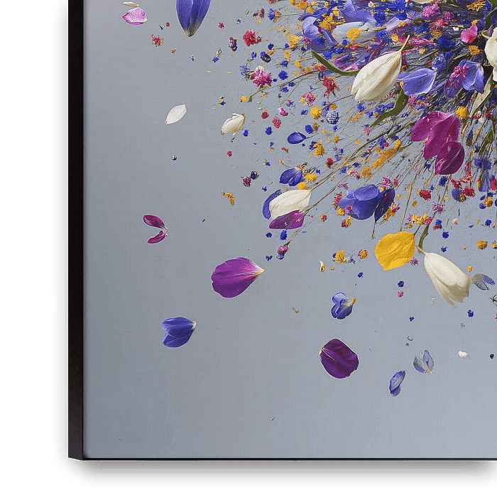 Ausbruch der Schönheit: eine Explosion von Blumen in farbenfrohen Tönen. Alles explodiert aus der Mitte heraus und vermittelt ein Gefühl von Bewegung und Energie. Die leuchtenden Farben und die dynamische Komposition verleihen dem Bild ein kraftvolles, funkelndes Aussehen.