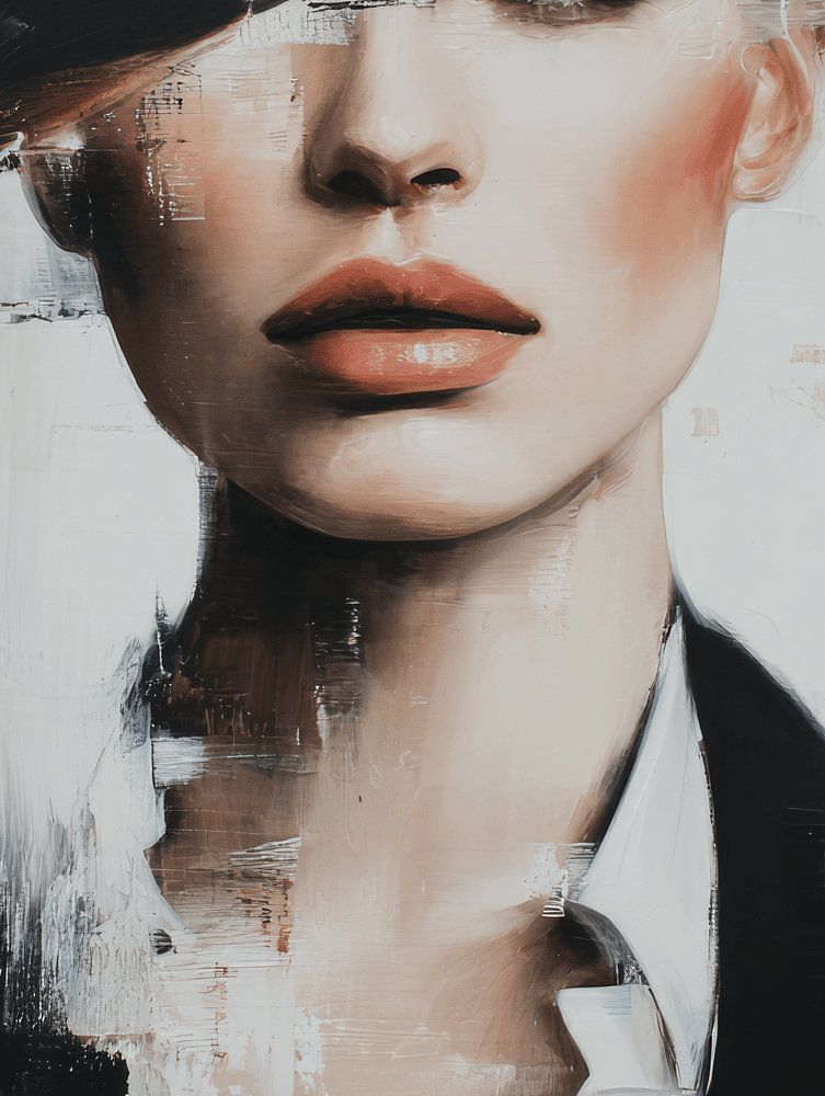 Dieses ausdrucksstarke Porträt vereint Mode, Abstraktion und Haltung in einem kraftvollen Kunstwerk. Die Frau, gekleidet in einen scharfen schwarzen Blazer und einen robusten Hut, strahlt Selbstbewusstsein und Geheimnis aus. Die dynamischen Pinselstriche - manchmal grob, manchmal subtil - erzeugen eine fast filmische Spannung und verleihen dem Werk einen einzigartigen, modernen Charakter.