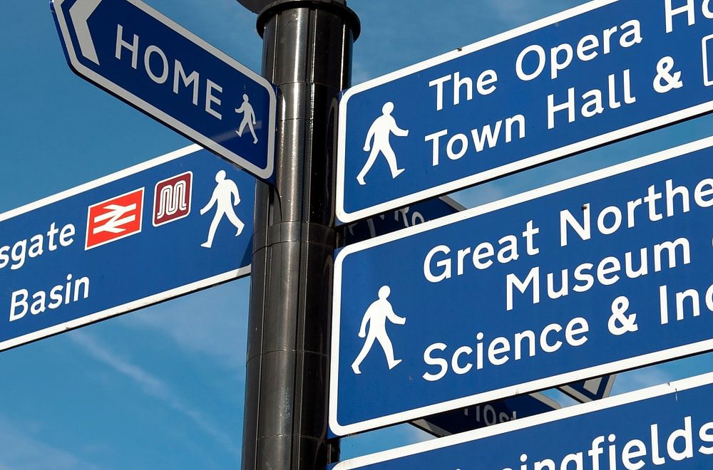 Manchester UK. Wegbeschreibung für Fußgänger zu den Standorten rund um Deansgate und Castlefield.