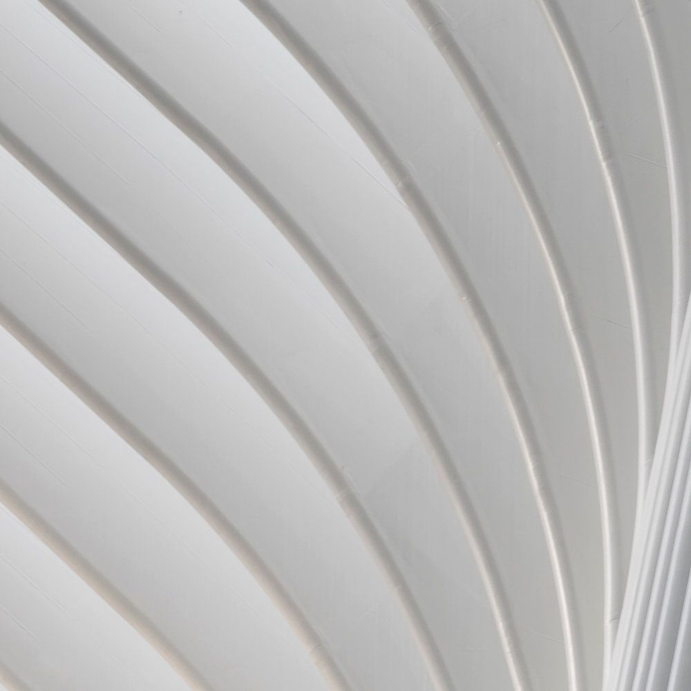 Ein Schwarz-Weiß-Detail vom Dach des Oculus in Manhattan, New York. Dieses Gebäude wurde nach den Anschlägen von 2001 errichtet und dient als Verkehrsknotenpunkt der Stadt. Die Details zeigen die "Flügel" des Gebäudes auf der Außenseite.