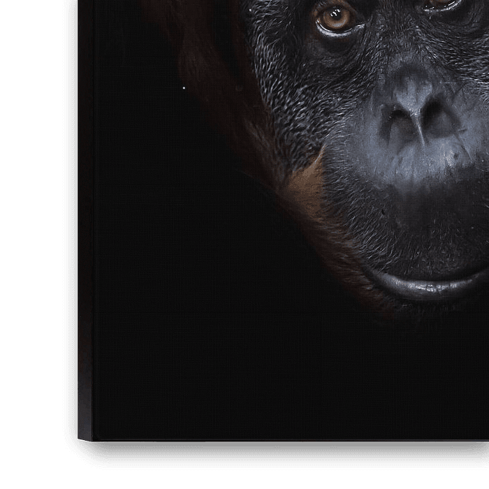Aussehen eines guten Jokers. Gescheites, intellektuelles Gesicht eines Orang-Utans mit ironischem Blick und einem halben Lächeln, isolierter schwarzer Hintergrund.
