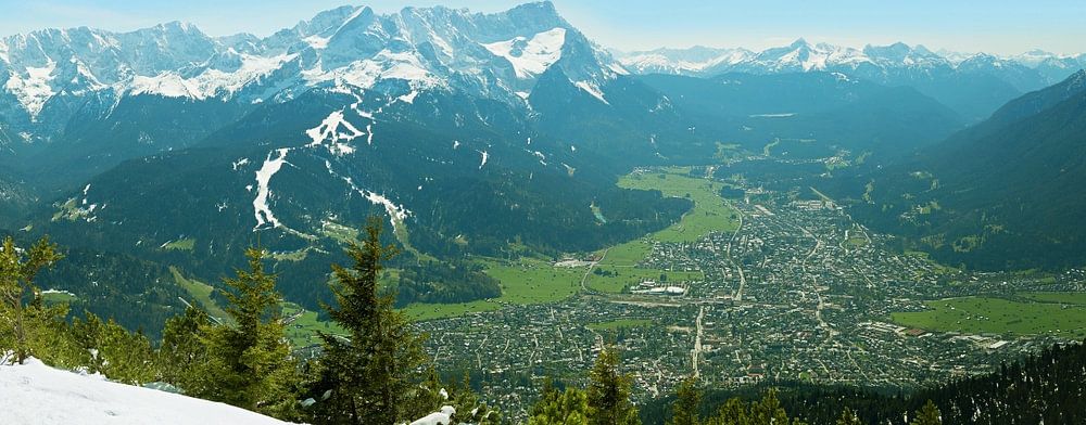 Aussicht vom Wank nach Garmisch-Partenkirchen und Zugspitze. Landschaft im Frühjahr in Oberbayern